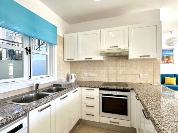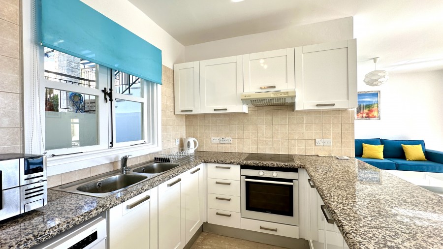 המטבח בתכנון פתוח, עם משטחי עבודה מגרניט, צמוד לפינת האוכל וכולל חלון הפונה לחצר הקדמית.